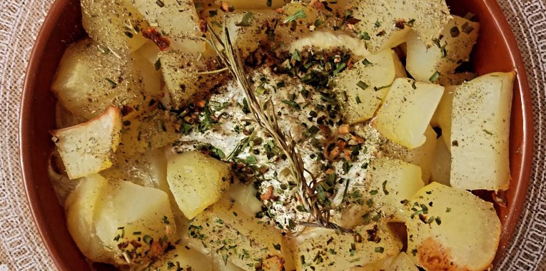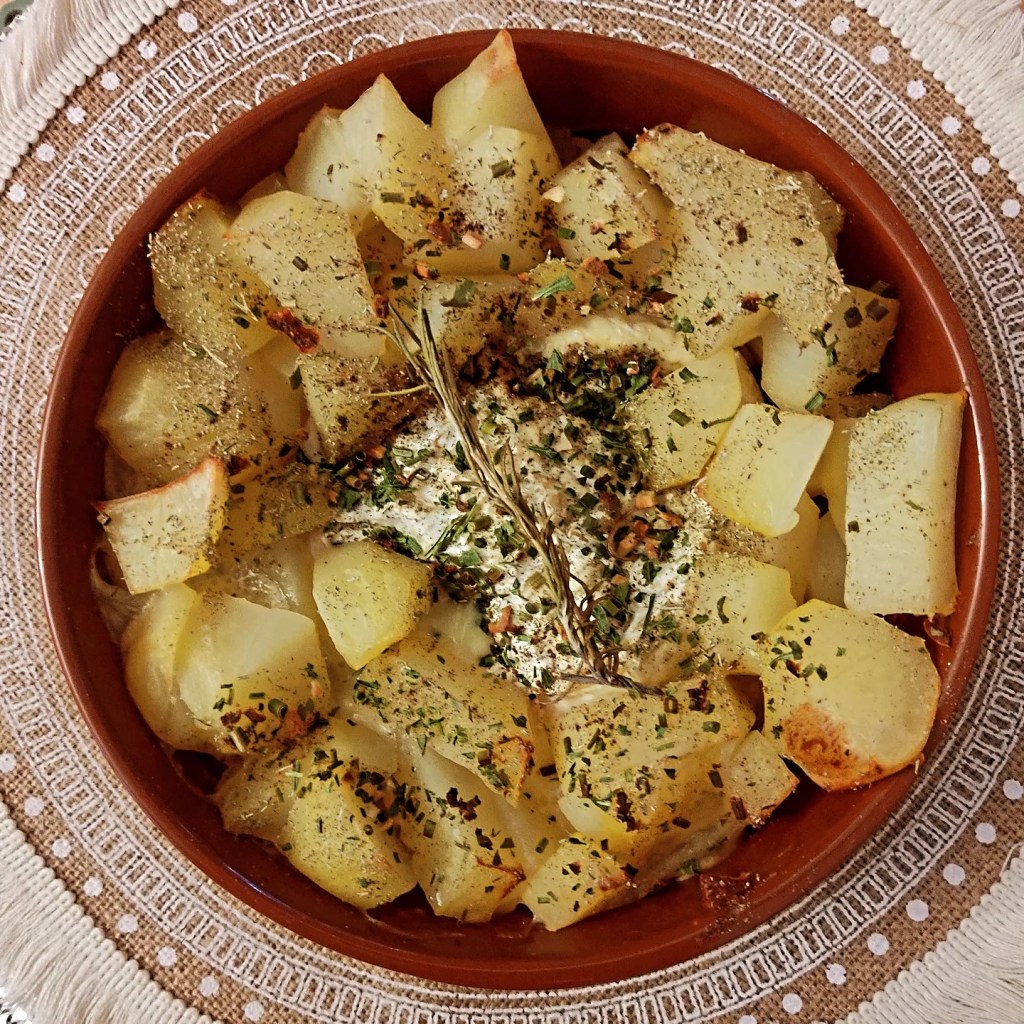- Dans un plat allant au four (ici en terre cuite) : disposez le camembert au centre, l’entourer des pommes de terre cuites