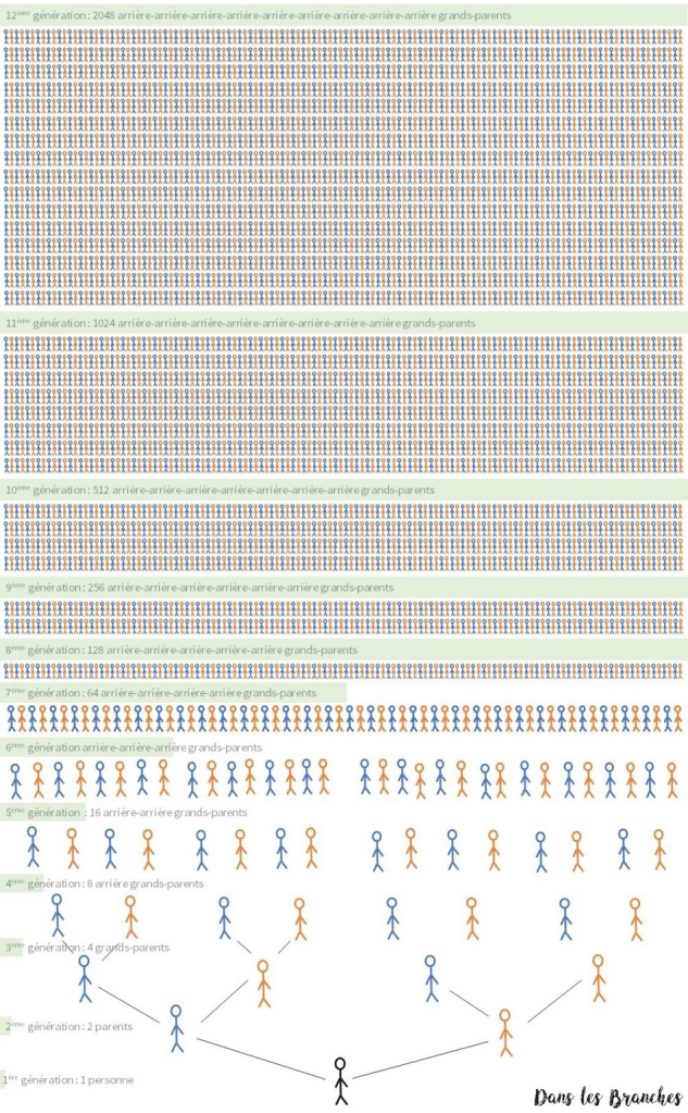 Regardez cet organigramme trouvé sur le site : https://www.dans-les-branches.fr/parcours/combien-d-ancetres-avons-nous/