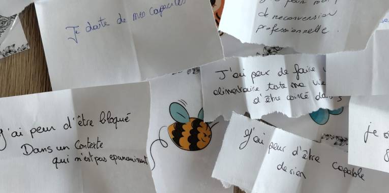 Ils se réinstallent autour de la table. Je leur confie 3 post-it sur lesquels ils formulent une peur un doute en commençant par « j’ai peur, je doute, je stresse à l’idée de.. ». Les post-it sont mélangés dans un panier.